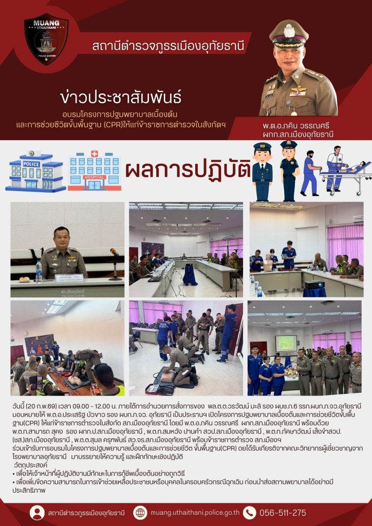 วันนี้ (20 ก.พ.69) เวลา 09.00 – 12.00 น. ภายใต้การอำนวยการสั่งการของ พล.ต.ต.วรวัฒน์ มะลิ รอง ผบช.ภ.6 รรก.ผบก.ภ.จว.อุทัยธานี มอบหมายให้ พ.ต.อ.ประเสริฐ บัวขาว รอง ผบก.ภ.จว. อุทัยธานี เป็นประธานฯ เปิดโครงการปฐมพยาบาลเบื้องต้นและการช่วยชีวิตขั้นพื้นฐาน(CPR) ให้แก่ข้าราชการตำรวจในสังกัด สภ.เมืองอุทัยธานี โดยมี พ.ต.อ.ภคิน วรรณศรี ผกก.สภ.เมืองอุทัยธานี พร้อมด้วย พ.ต.ท.สามารถ สุคง รอง ผกก.ป.สภ.เมืองอุทัยธานี , พ.ต.ท.สมหวัง ปานคำ สวป.สภ.เมืองอุทัยธานี , พ.ต.ท.ภัคษาวัฒน์ เส็งขำสวป.(ชส.)สภ.เมืองอุทัยธานี , พ.ต.ต.สุมล ครุฑพันธ์ สว.จร.สภ.เมืองอุทัยธานี พร้อมข้าราชการตำรวจ สภ.เมืองฯร่วมเข้ารับการอบรมในโครงการปฐมพยาบาลเบื้องต้นและการช่วยชีวิต ขั้นพื้นฐาน(CPR) ดยได้รับเกียรติจากคณะวิทยากรผู้เชี่ยวชาญจากโรงพยาบาลอุทัยธานี มาบรรยายให้ความรู้ และฝึกทักษะเชิงปฏิบัติ