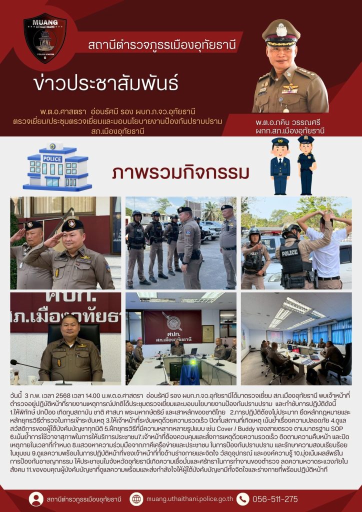 วันนี้ 3 ก.พ. เวลา 2568 เวลา 14.00 น.พ.ต.อ.ศาสตรา อ่อนรัศมี รอง ผบก.ภ.จว.อุทัยธานีได้มาตรวจเยี่ยม สภ.เมืองอุทัยธานี พบเจ้าหน้าที่ตำรวจอยู่ปฏิบัติหน้าที่รายงานเหตุการณ์ปกติได้ประชุมตรวจเยี่ยมและมอบนโยบายงานป้องกันปราบปราม และกำชับการปฏิบัติดังนี้