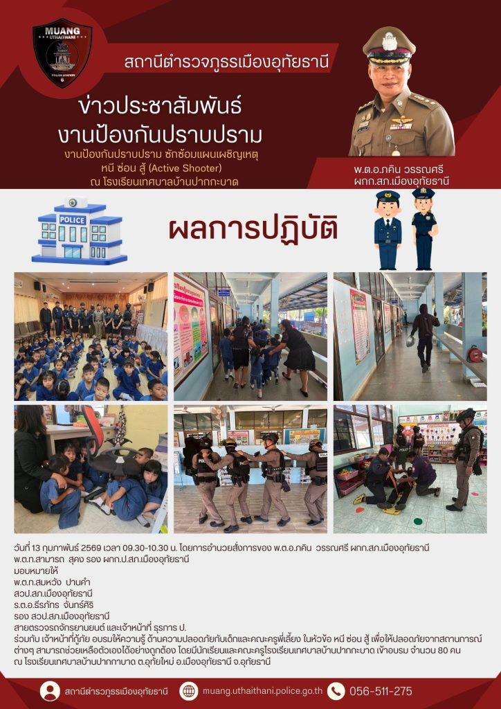 วันที่ 13 กุมภาพันธ์ 2569 เวลา 09.30-10.30 น. โดยการอำนวยสั่งการของ พ.ต.อ.ภคิน วรรณศรี ผกก.สภ.เมืองอุทัยธานี พ.ต.ท.สามารถ สุคง รอง ผกก.ป.สภ.เมืองอุทัยธานี มอบหมายให้ พ.ต.ท.สมหวัง ปานคำ สวป.สภ.เมืองอุทัยธานี ร.ต.อ.ธีรภัทร จันทร์ศิริ รอง สวป.สภ.เมืองอุทัยธานี สายตรวจรถจักรยานยนต์ และเจ้าหน้าที่ ธุรการ ป. ร่วมกับ เจ้าหน้าที่กู้ภัย อบรมให้ความรู้ ด้านความปลอดภัยกับเด็กและคณะครูพี่เลี้ยง ในหัวข้อ หนี ซ่อน สู้ เพื่อให้ปลอดภัยจากสถานการณ์ต่างๆ สามารถช่วยเหลือตัวเองได้อย่างถูกต้อง โดยมีนักเรียนและคณะครูโรงเรียนเทศบาลบ้านปากกะบาด เข้าอบรม จำนวน 80 คน ณ โรงเรียนเทศบาลบ้านปากกาบาด ต.อุทัยใหม่ อ.เมืองอุทัยธานี จ.อุทัยธานี